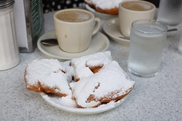 Eine besonders absurd große Schwäche hab‘ ich übrigens für Beignets. Dieses süße Gebäck (eine Mischung aus Kiachl und Donut mit sehr (!) viel Puderzucker) ist berühmt in New Orleans. Im originalen Café du Monde auf der Decatur Street muss man meistens in der Schlange warten, um einen Tisch zu bekommen. Aber es lohnt sich! Für diese kleine verführerische, Diabetes fördernde Köstlichkeit stellen sich nicht nur Massen an Touristen an, sondern auch Einheimische finden ihren Weg in das beliebte Café. (Es hat übrigens 24/7 geöffnet- schwer zu meiner Sucht beitragend.)